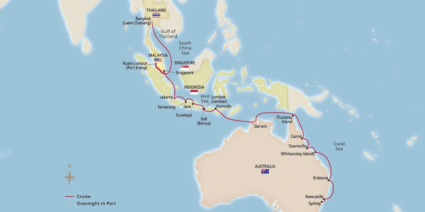 Enjoy a 29-day cruise encompassing the rich and varied cultures of Asia and Australia when you combine Bangkok, Bali & Beyond and Komodo & the Australian Coast. Meet the people who shape capitals of Asian art and culture from Malaysia to Indonesia. Witness the cerulean beauty of Australia’s coastal isles. And get to know the embracing Aussies. Overnight stays in Bangkok, Jakarta, Bali and Darwin help immerse you in this breathtaking corner of the world.