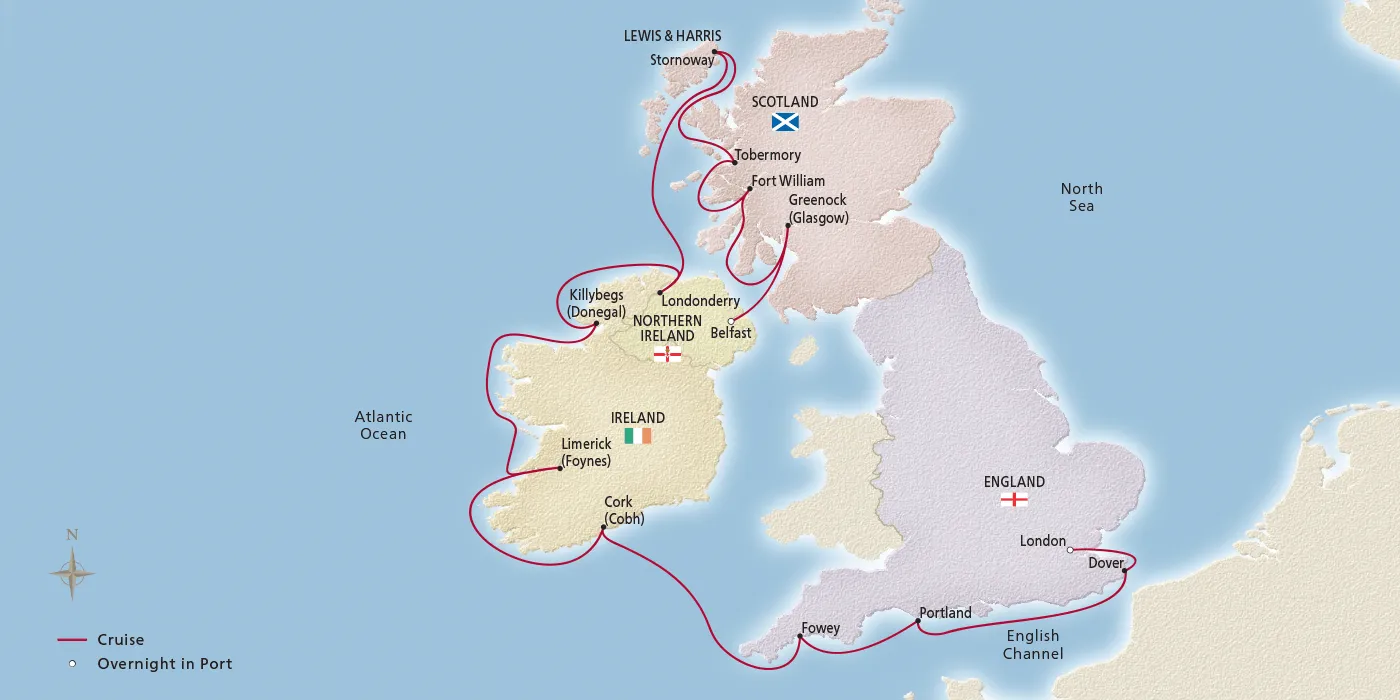 Traverse the coast of the British Isles and the stunning shores of Cornwall and Scotland. Call at the historic Scottish ports of Greenock and Tobermory, and visit Fort William to behold the splendor of Ben Nevis. Discover Ireland’s rugged coastline and visit the ancient city of Limerick, with the iconic King John Castle on the banks of the River Shannon. Your voyage is bookended with overnight stays in London and Belfast, allowing you to explore more.