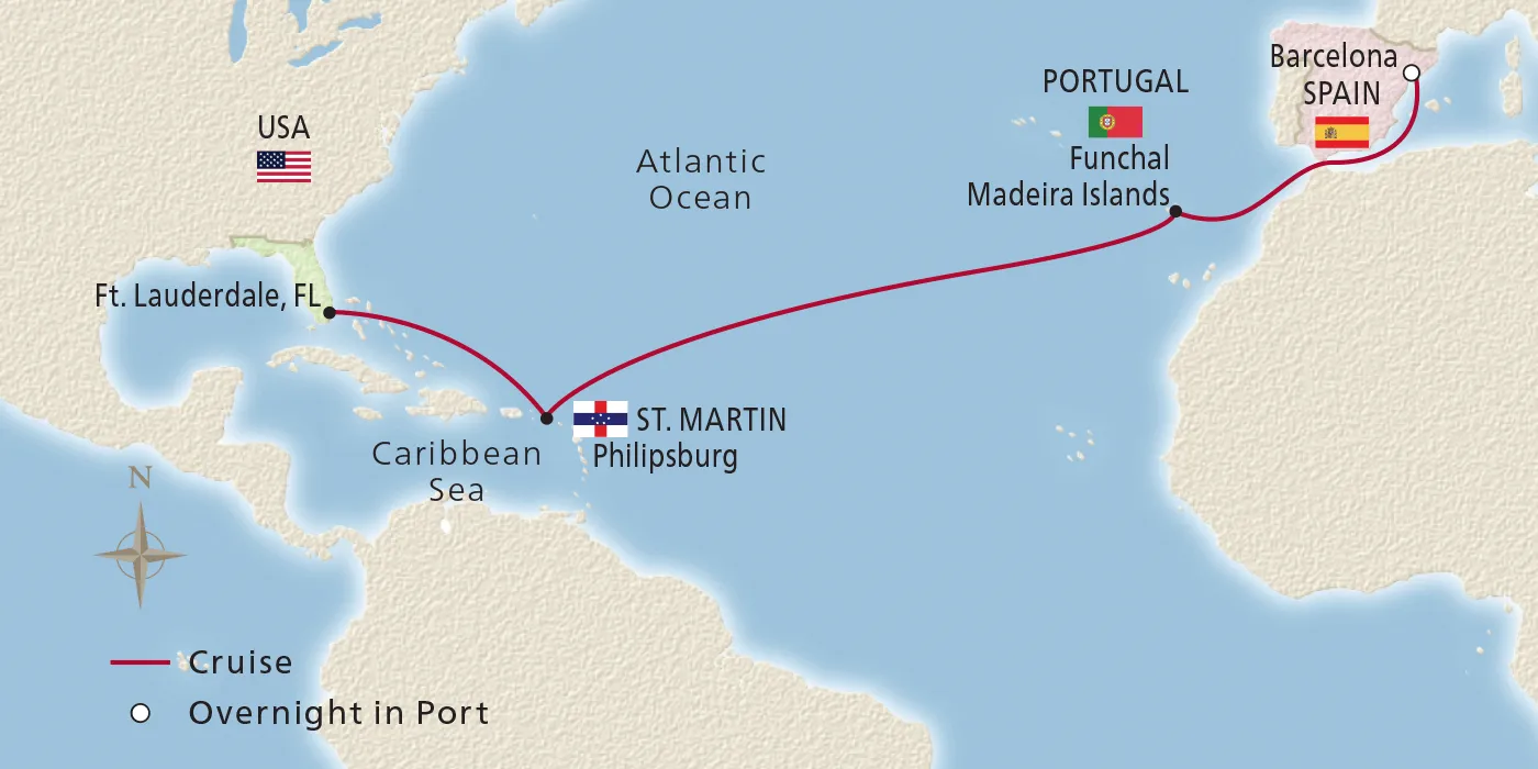 Set sail on a voyage spanning both the New World and the Old. Explore the Portuguese influence and tropical beauty of the “Garden Island” of Madeira. Immerse in the enchanting Caribbean landscapes and half-French, half-Dutch culture of St. Martin. Journey across the legendary Mediterranean Sea, home to some of history’s greatest empires, and the storied Atlantic Ocean, its deep waters providing a centuries-old passageway between Europe and the Americas.